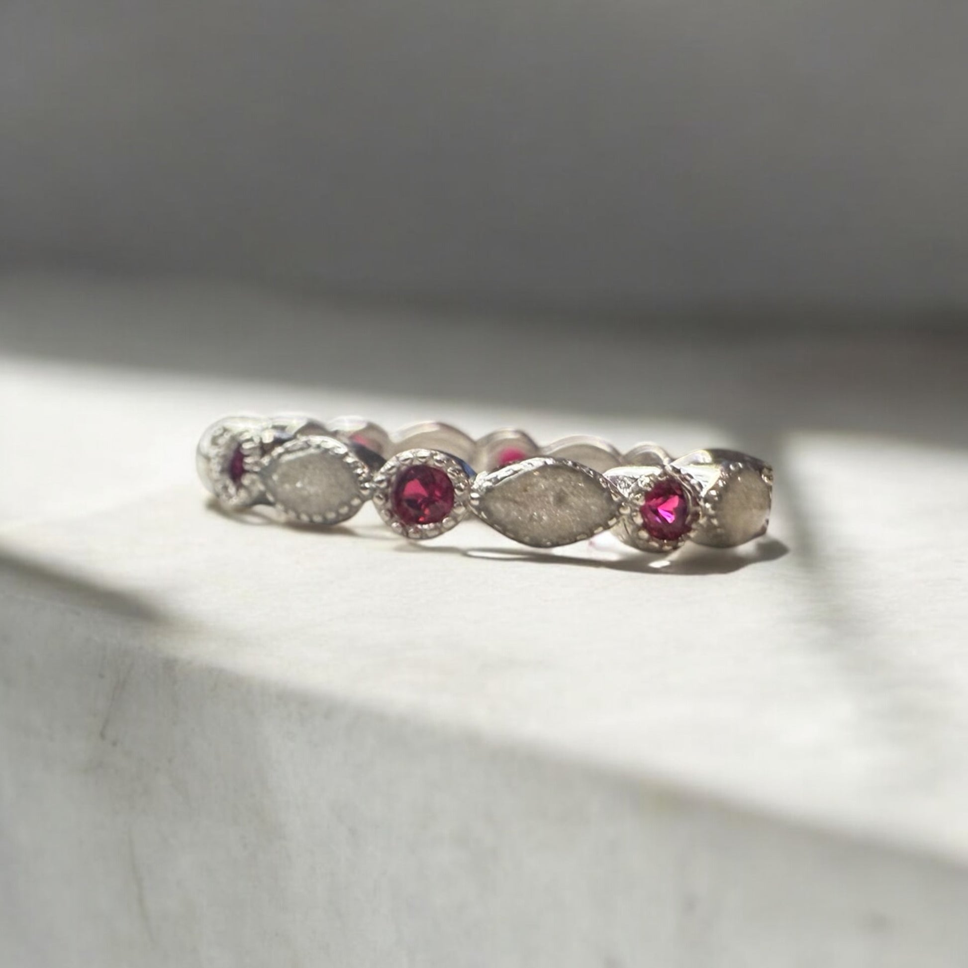 The Bella Ring is more than just a beautiful accessory - it's a unique piece of custom jewelry that holds a special meaning. Crafted with care, it can commemorate the memory of a loved one through the custom option of cremation and breastmilk jewelry. Cherish your memories with this heartfelt piece. This ring has stones 1/2 way around the band.