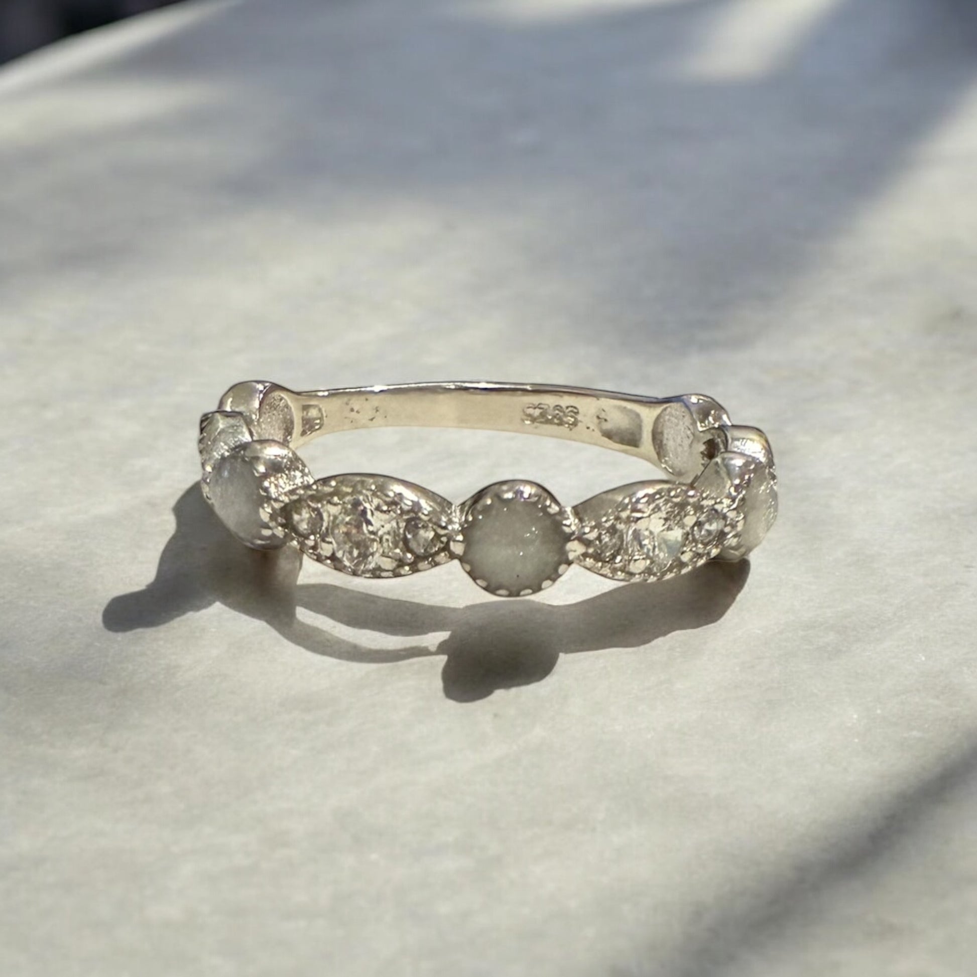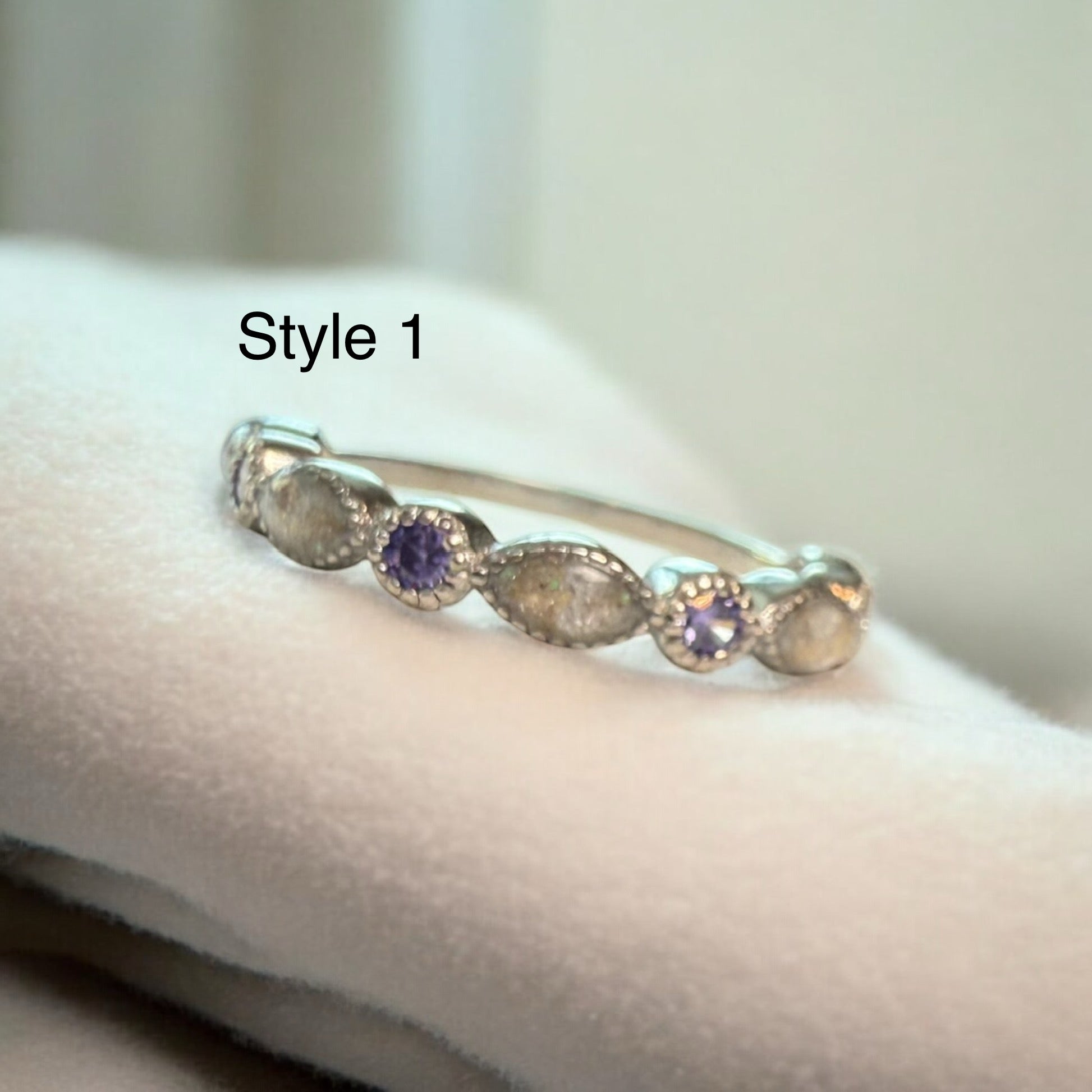 The Bella Sterling Silver Ring is more than just a beautiful accessory - it's a unique piece of custom jewelry that holds a special meaning. Crafted with care, it can commemorate the memory of a loved one through the custom option of cremation and breastmilk jewelry. Cherish your memories with this heartfelt piece. This ring has stones 1/2 way around the band.