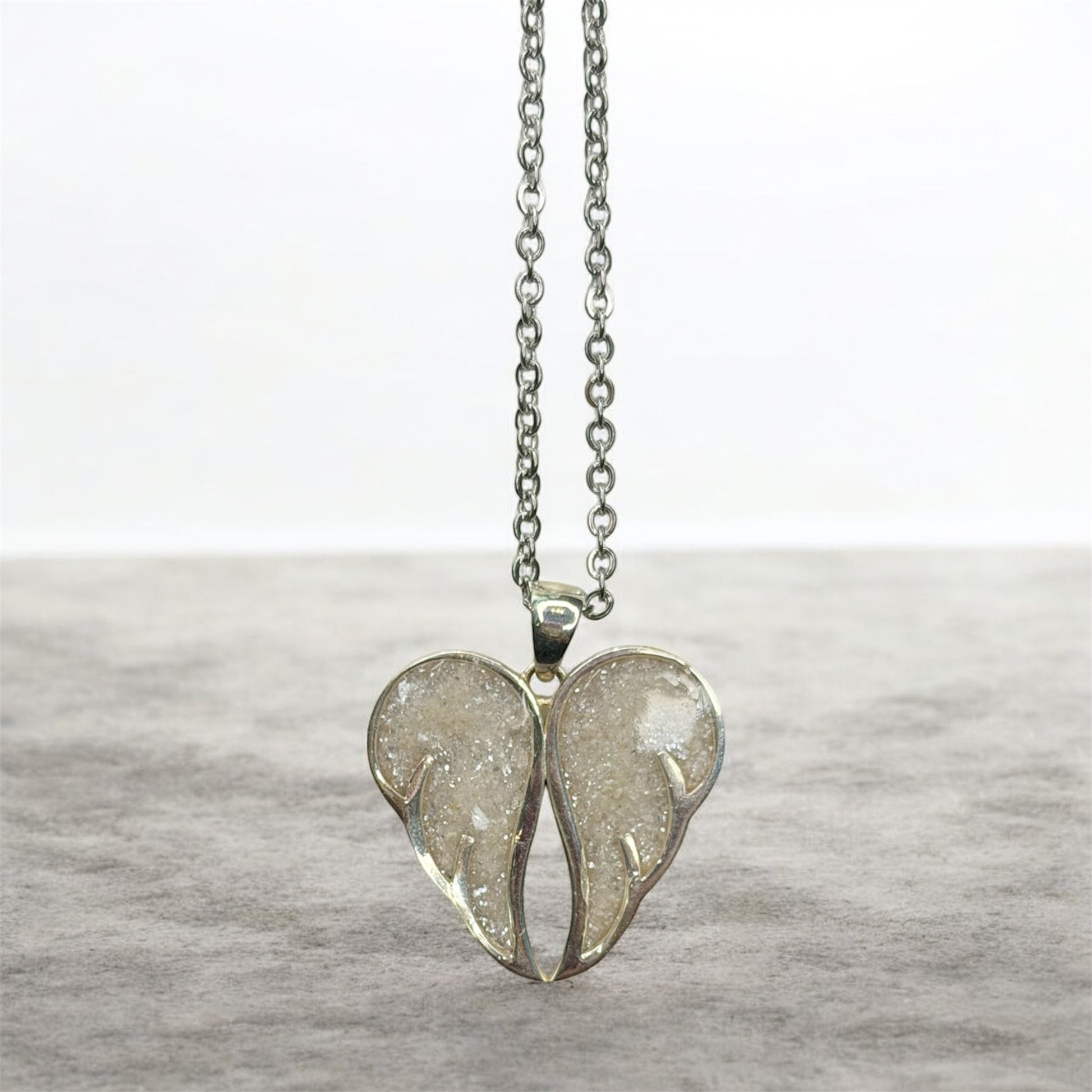 The Angel Wings Sterling Silver Necklace is more than just a beautiful accessory - it's a unique piece of custom jewelry that holds a special meaning. Crafted with care, it can commemorate the memory of a loved one through the custom option of cremation and breastmilk jewelry. Cherish your memories with this heartfelt piece.