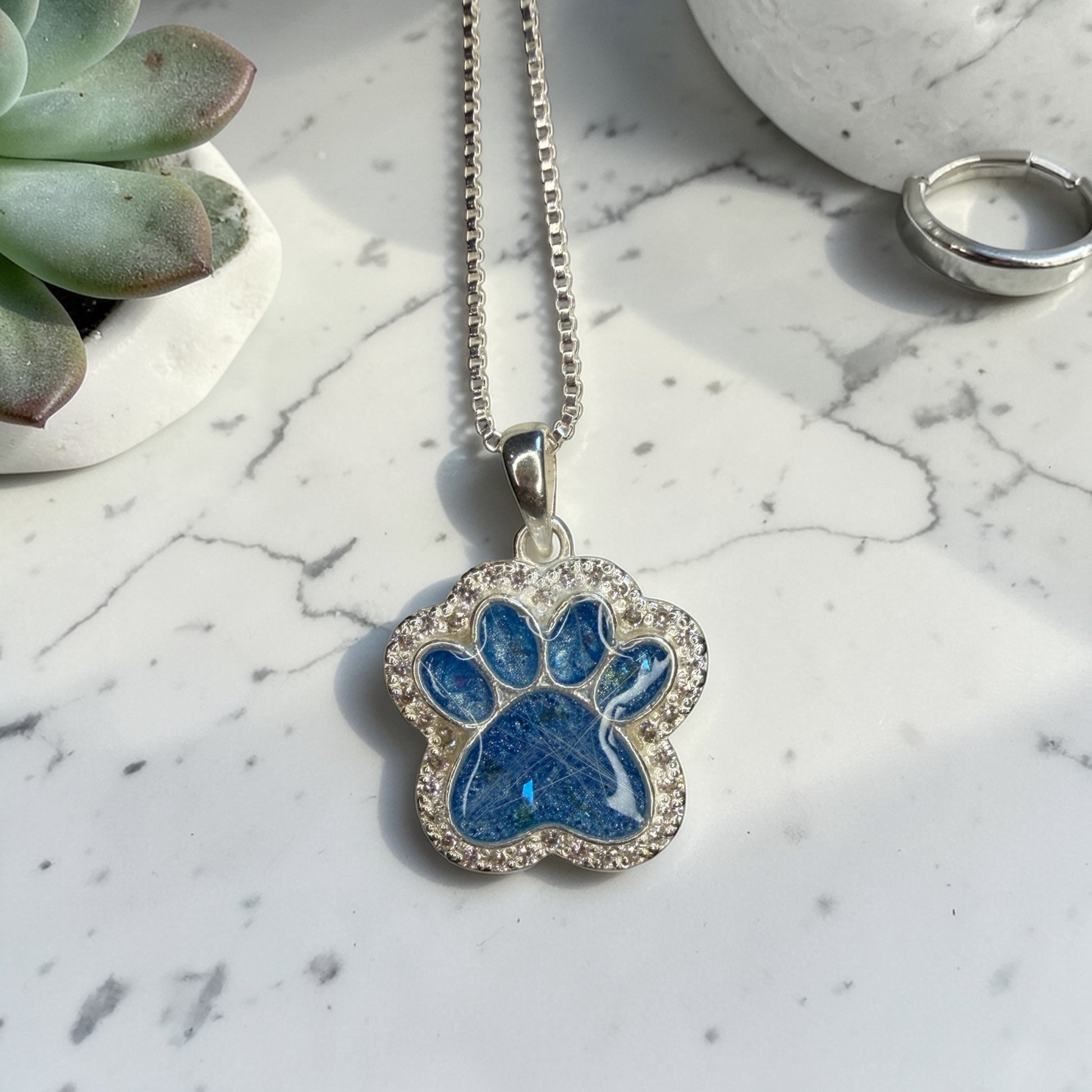 Celebrate the everlasting bond with your beloved pet with this beautifully crafted Diamond paw print necklace. Made from genuine sterling silver, this meaningful piece features a delicate angel wing embracing a detailed paw print—symbolizing protection, love, and the cherished memory of a loyal companion. Perfect as a memorial or tribute, this necklace offers a comforting reminder that your furry friend is always by your side, now and forever. A thoughtful gift for pet lovers and a touching keepsake for anyone who has lost a pet.