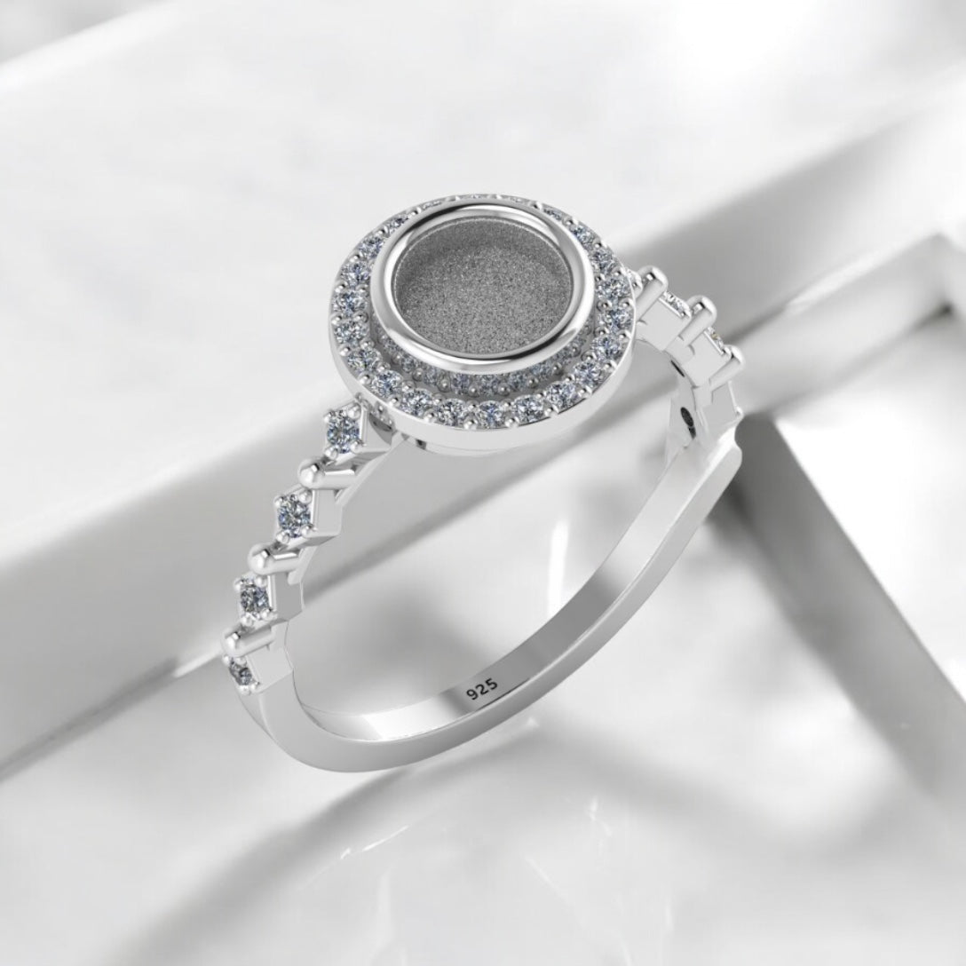 The Carmen Sterling Silver Ring is more than just a beautiful accessory - it's a unique piece of custom jewelry that holds a special meaning. Crafted with care, it can commemorate the memory of a loved one through the custom option of cremation and breastmilk jewelry. Cherish your memories with this heartfelt piece.