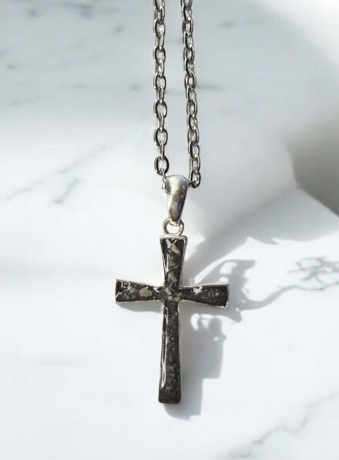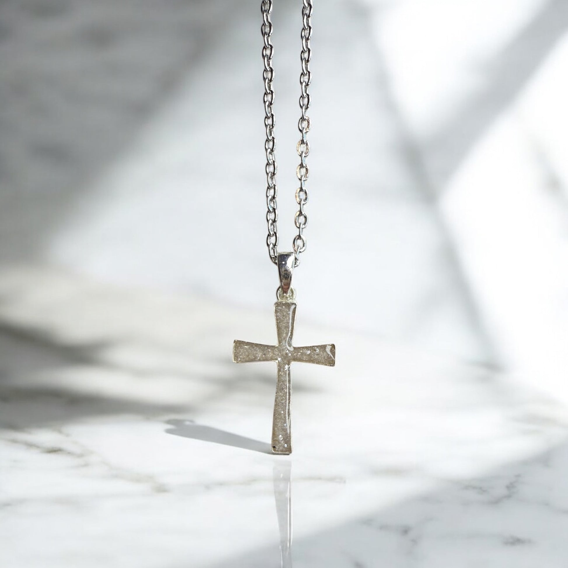 The Dainty Cross Sterling Silver Necklace is more than just a beautiful accessory - it's a unique piece of custom jewelry that holds a special meaning. Crafted with care, it can commemorate the memory of a loved one through the custom option of cremation and breastmilk jewelry. Cherish your memories with this heartfelt piece.